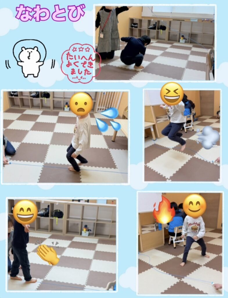 こんにちは!こぱんはうすさくら鶴瀬教室です🌸 今回のプログラムは「なわとび」です! 縄をヘビさんに見立てて、床の上でゆらゆら動かし、縄に当たらないようにくぐったり タイミングを見てジャンプしたりして楽しみ… もっと読む »